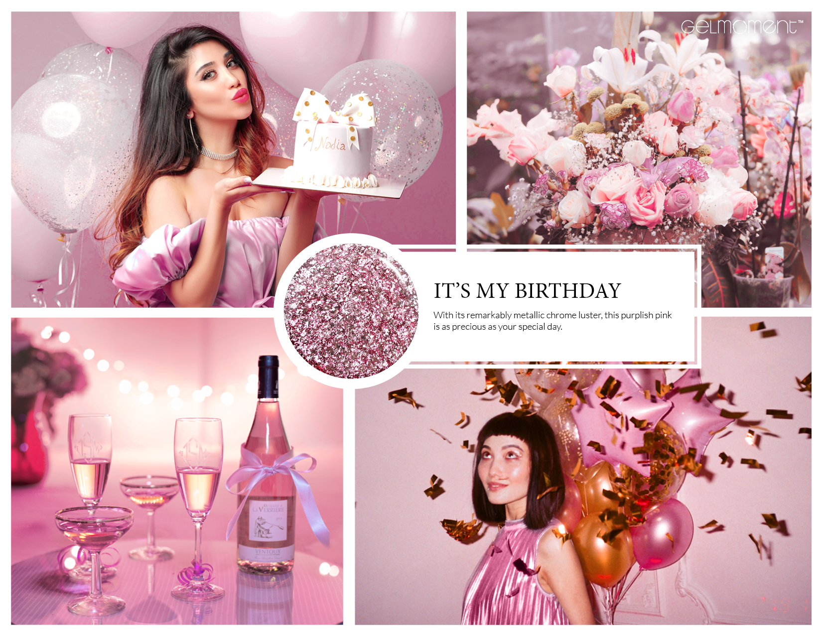 Silver rose. Metallic foil sparkle. Opaque. Cool undertone.